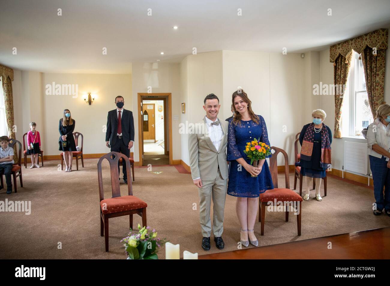 Couple Getting Married At St Albans Register Office During Coronavirus Covid 19 Pandemic 2020 With Guests Wearing Face Masks And Face Coverings Stock Photo Alamy